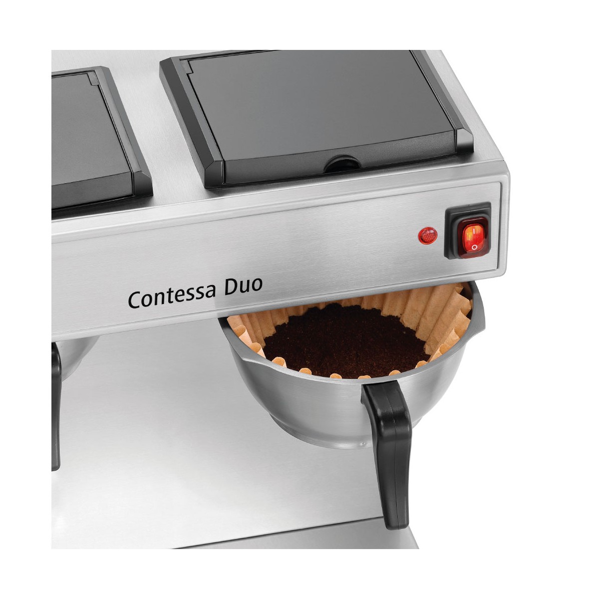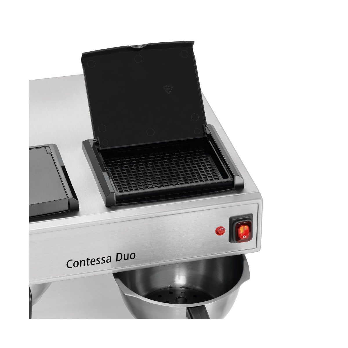 Η τέλεια μηχανή καφέ για τη διάθεση φίλτρου καφέ σε μπουφέ, κέτερινγκ ή εκδηλώσεις. Με την Contessa Duo μπορείτε να ετοιμάσετε έως και 13 φλιτζάνια ανά εστία απευθείας στην ισοθερμική κανάτα. Τα βελτιωμένα θερμαντικά στοιχεία από ανοξείδωτο χάλυβα προσφέρουν βέλτιστη μετάδοση θερμότητας.