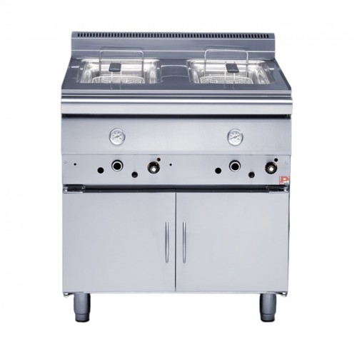 Διπλή φριτέζα αερίου με κλειστή βάση και δύο κάδους, χωρητικότητας 8 + 8 λίτρων λαδιού, με δύο θερμοστάτες και δύο θερμόμετρα