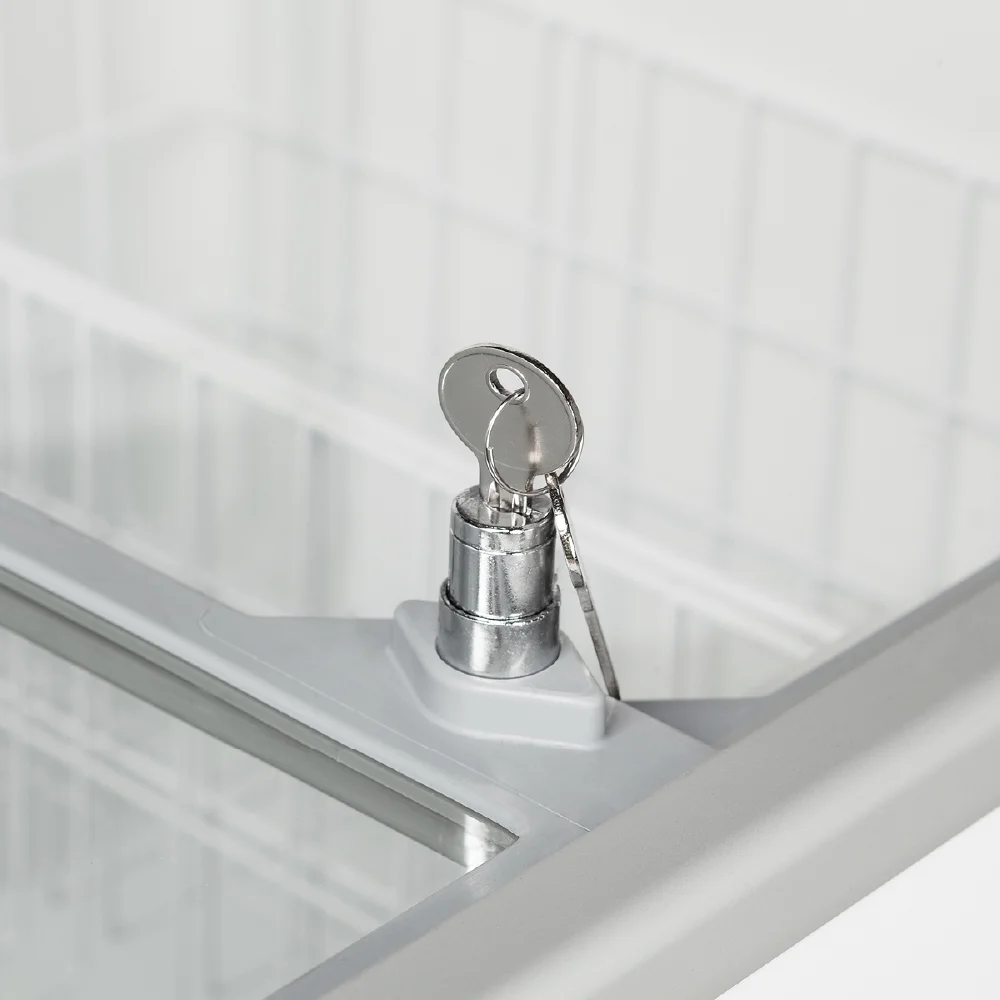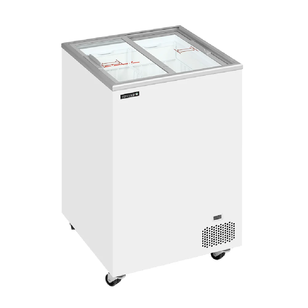 Καταψύκτης με ίσια συρόμενα κρύσταλλα, στατικής ψύξης και συνολικής χωρητικότητας 191 lt. Προμηθευτής Tefcold Δανίας. Διαστάσεις 720x630x892(h)mm