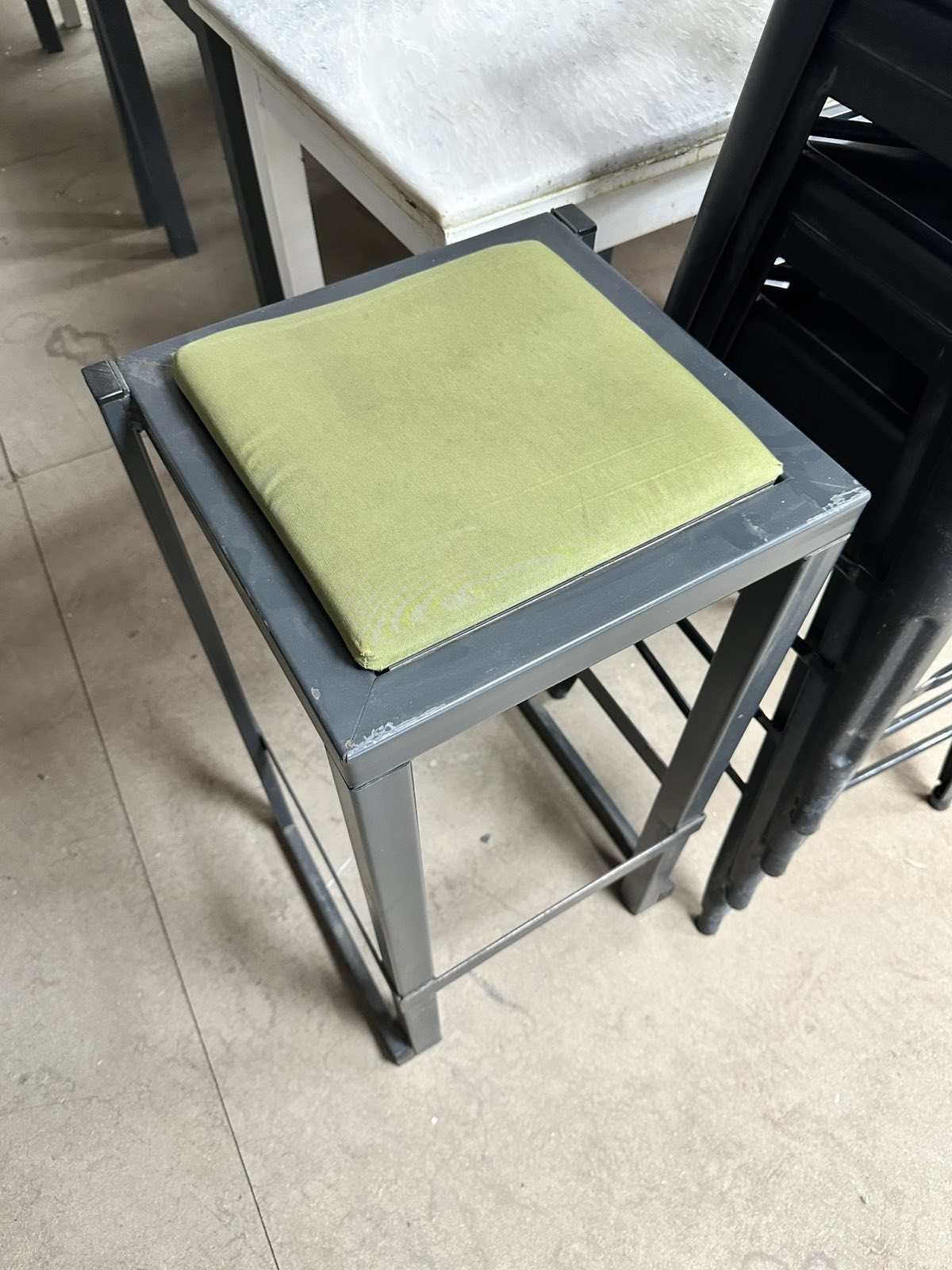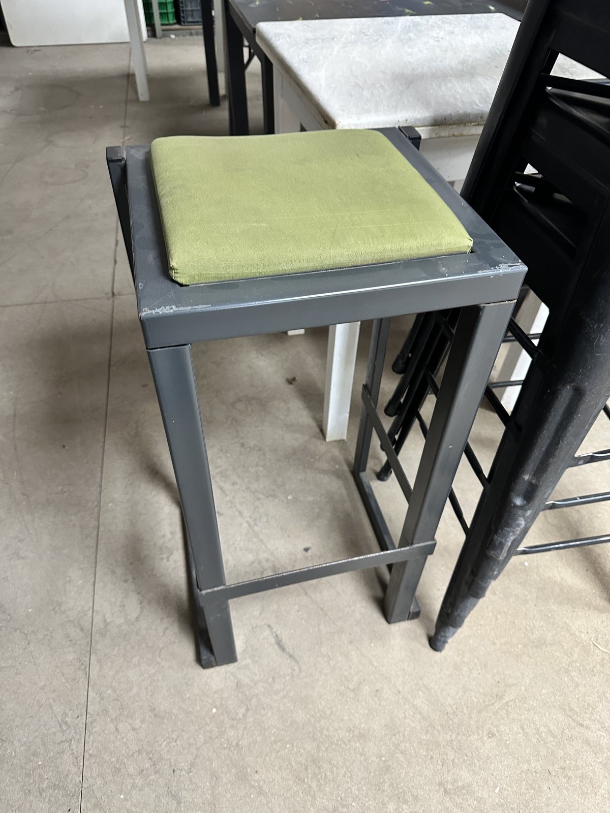Μεταχειρισμένο σκαμπό με μεταλλικά πόδια και πράσινο ύφασμα .